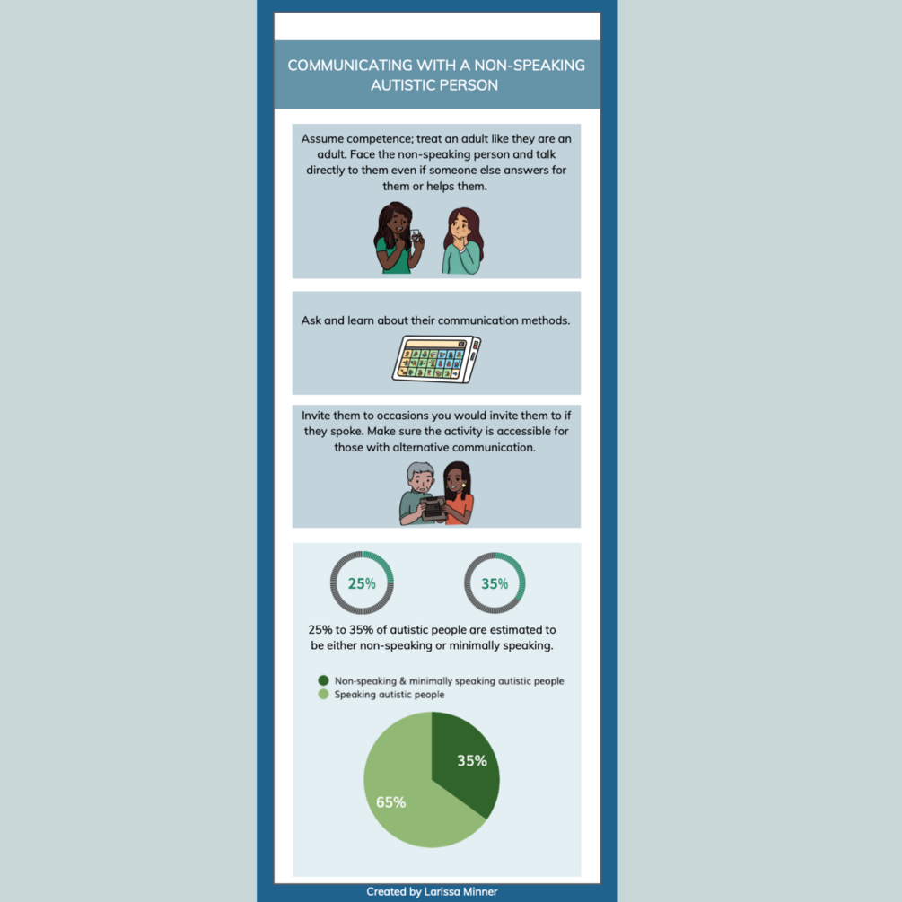 An infographic that gives some general tips for speaking with a non-speaking autistic person. I highly recommend you check out blogs written by non-speakers.