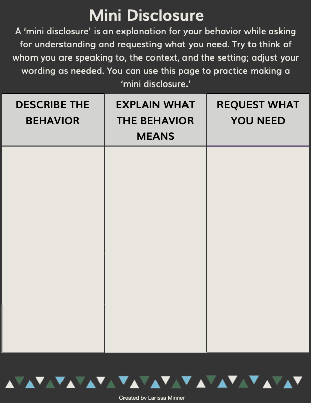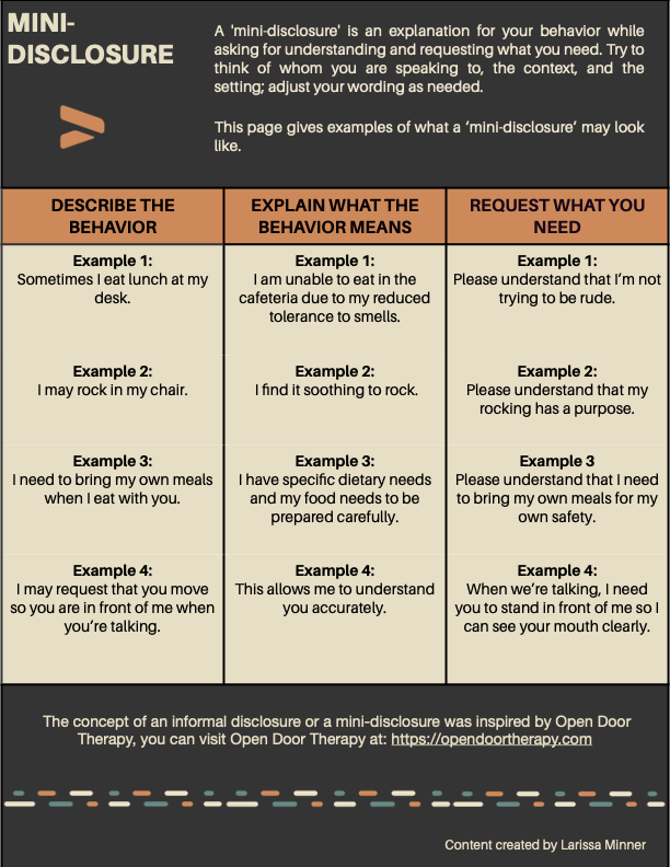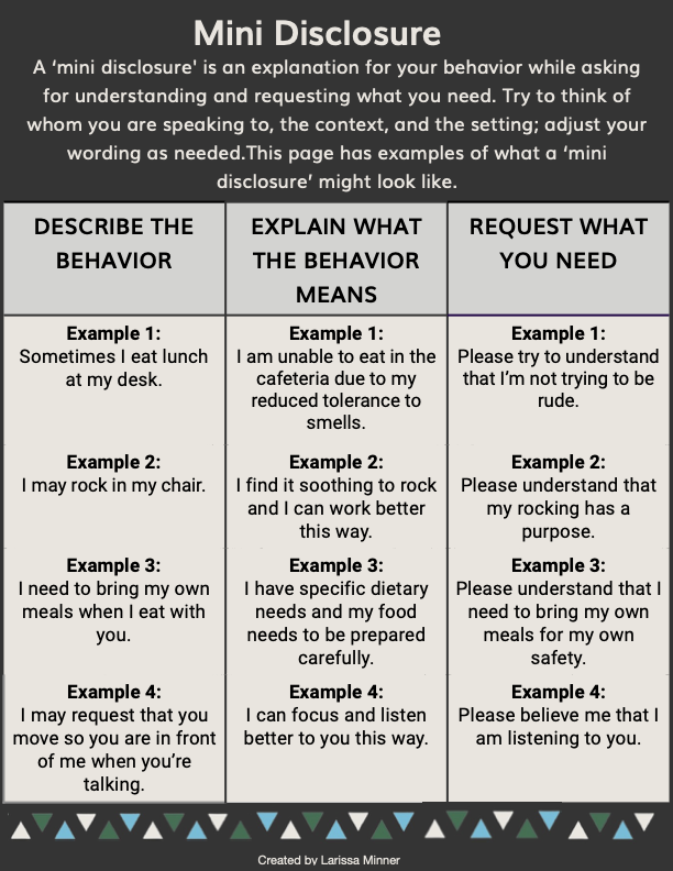 A fillable worksheet with examples on how to try to get your needs met without formally disclosing a diagnosis.